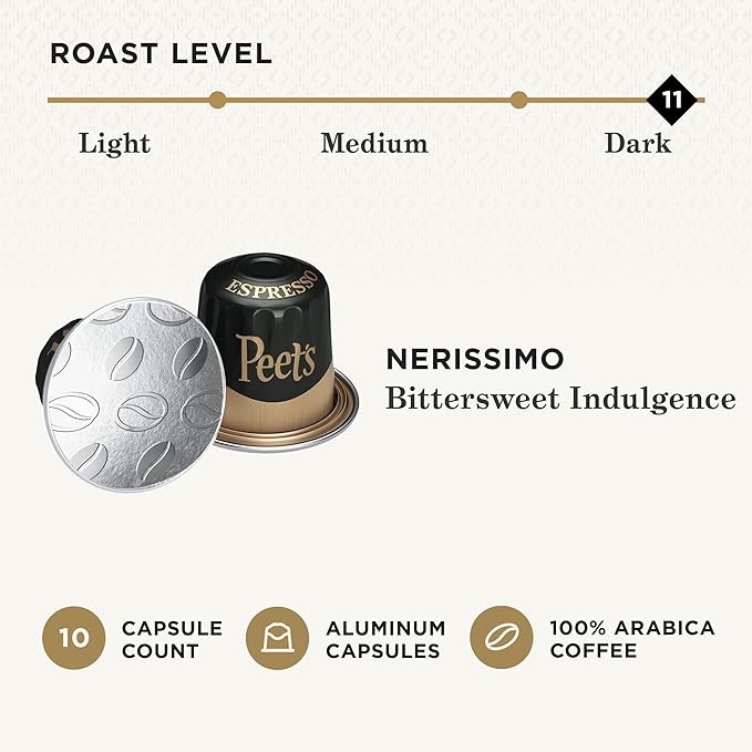 Individually sealed espresso capsules with dark roasted beans. Flavor Profile: Aroma: Chocolate, Cocoa; Body: Full; Acidity: Low; Notes: Caramel, Nutty.