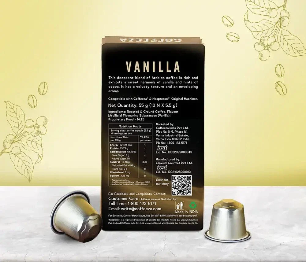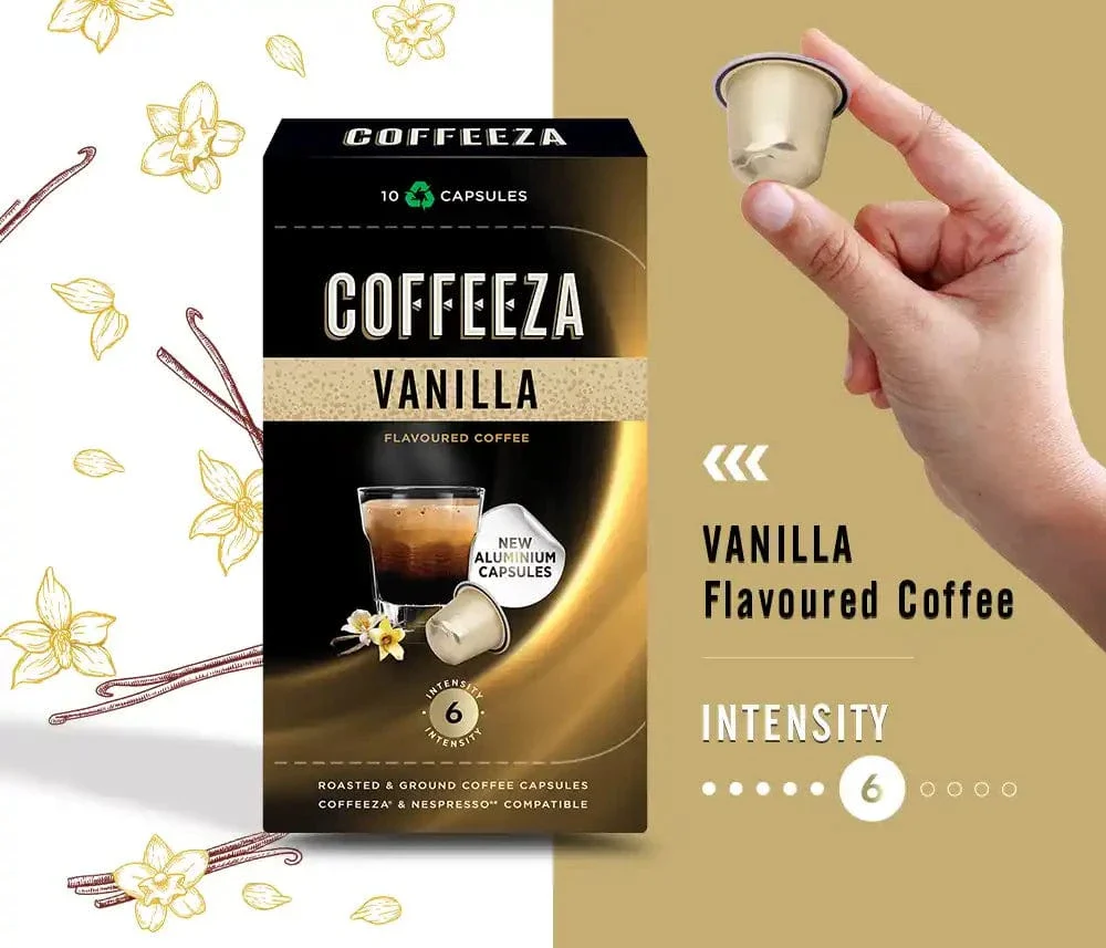 Freeze-dried coffee capsules with natural vanilla infusion. Flavor Profile: Aroma: Vanilla, Cocoa; Body: Medium; Acidity: Balanced; Notes: Vanilla, Chocolate.