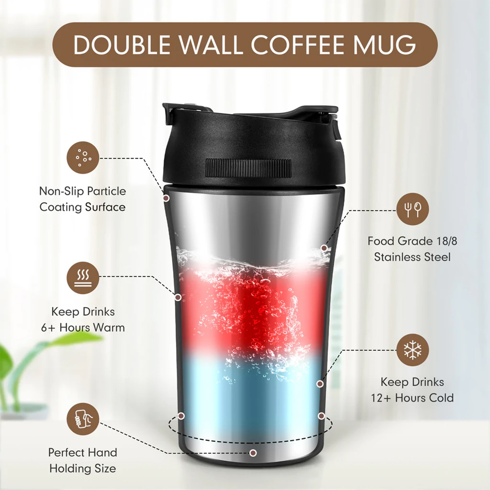 Stainless steel travel mug, spill-proof lid, 400ml capacity. Ideal for commute or office. Tips: Hand wash recommended for longevity.